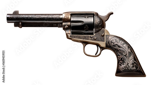 Vintage cowboy revolver with patterned grip isolated on white background old western firearm for history or display