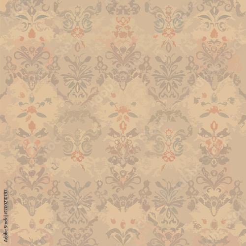 Vintage damask pattern with floral elements in neutral tones and distressed texture, patern seamless, Stock royalty.