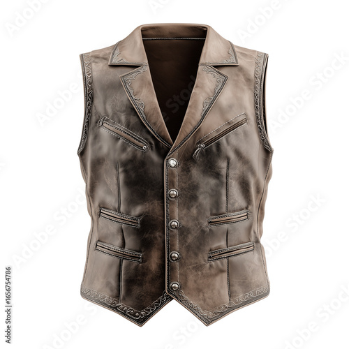 waistcoat, vest, leather, brown, vintage, distressed, worn, aged, rugged, fashion, clothing, apparel, outerwear, garment, menswear, style, sewing, tailoring, buttons, pocket, collar, sleeveless, front, view, studio, shot, isolated, cut-out, transparent, background, object, single, no, people, texture, material, fabric, craftsmanship, detail, classic, retro, country, western, biker, rocker