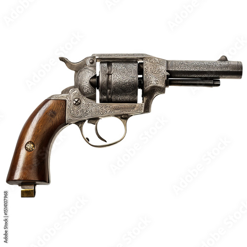 Vintage firearm with intricate details, a symbol of history and craftsmanship. The revolver features a wooden grip and a metal body. The weapon is in good condition