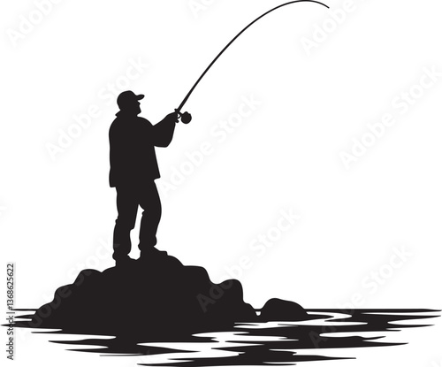 fishing, fisherman, angling, rod, reel, fish, silhouette, vector, illustration, design, outdoors, nature, water, lake, river, ocean, sea, sport, hobby, adventure, camping, relaxation, hook, net, bait, tackle, island, rock, shore, coastline, minimalist, art, graphic, woodcut, engraving, classic, retro, rustic, wilderness, hunting, leisure, recreation, hat, traditional, vintage, landscape