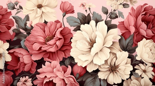 floral, arrangement, vintage, cream, red, bloom, flower, pink, white, leaf, bud, art, illustration, design, pattern, background, texture, style, romantic, elegant, classic, decorative, nature, beauty, garden, botanical, soft, pastel, delicate, beautiful, closeup, fine, painting, artistic, digital, realistic
