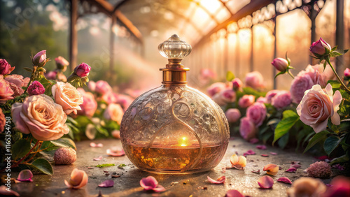 vintage glass flask filled with warm amber liquid surrounded by roses