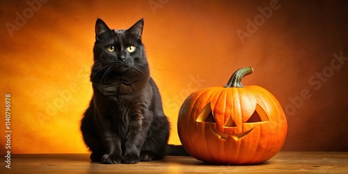 black cat, halloween, pumpkin, orange background, vintage, photo, autumn, skittish, fall, cat, october, holiday, image, photo, picture, copy space, retro, antique, orange, autumn, festive, celebration