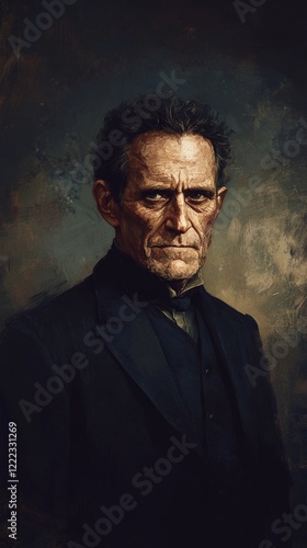 Vintage Illustration of Old Man with Brown Hair and Thoughtful Expression in Dark Suit Against Dimly Lit Background, Generative AI