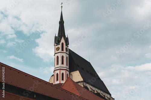 Vintage image of the facade of St. Vitus Church in Cesky Krumlov, Czech Republic, during a sunny day
