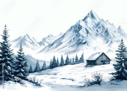 Vintage Ink Drawing of Snow-Covered Mountains and Cabin - Detailed Winter Landscape Sketch - Generative AI