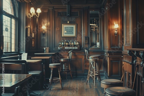 pub, bar, interior, vintage, wood, dark, antique, furniture, dim, cosy, light, window, warm, glow, brown, paneling, beam, table, chair, stool, glasses, bottle, shelf, mirror, signs, brass, lamp, shadow, pattern, texture, old, rustic, traditional, classic, historic, atmosphere, design, style, photo, image, photo