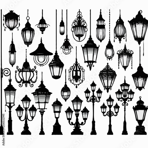 Vintage Lanterns and Ornate Fixtures: Urban Decor with Antique Style Silhouettes in Nights Illumination