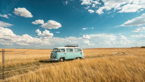 van, camper, vintage, retro, travel, road, trip, adventure, journey, exploration, nature, landscape, field, grass, gold, wheat, summer, sunny, daylight, blue, sky, cloud, fluffy, driving, dirt, off, countryside, rural, scenic, idylli, freedom, escape, vacation, holiday, leisure, transportation, vehicle, classic, nostalgia, wanderlust, get-away, destination, open, horizon, immensity, space, serene, peaceful