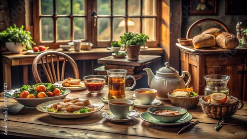 Vintage Lunch Break Scene with Classic Tableware, Old-fashioned Food, and Cozy Atmosphere