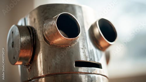 Vintage metal robot head close up antique toy automaton retro steel face industrial design steampunk art
