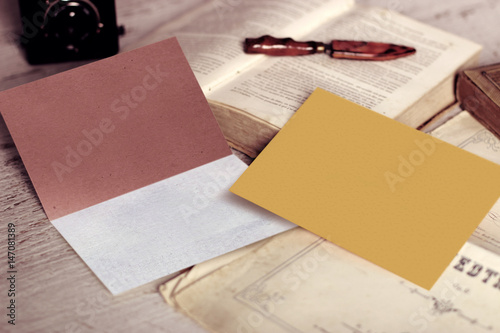 Vintage Mockup of Business Card and Blank Envelope with Copyspace - for Use in Invitations, Postcards, Logo or Menu, on Wooden Table at Angular View