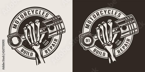 piston, motorcycle, engine, round, skeleton, hand, custom, repair, service, motorcyclist, speed, transportation, vehicle, chopper, inscription, workshop, motorbike, garage, motor, monochrome, isolated, dark, light, vector, illustration, logotype, logotype, vintage, retro, patch, signs, icon, graphic, art, design, symbol, element, print, label, stamp, emblem, apparel, t-shirt
