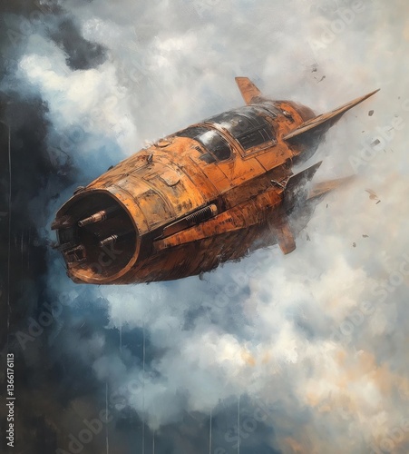 spaceship, orange, cloud, skyward, flight, vintage, atmospheric, dynamic, propulsion, futuristic, travel, aircraft, exploration, sky, aerial, motion, velocity, power, design, technology, engineering, journey, altitude, adventure, space, science, fiction, rust, weathered, dramatic, impact, ascent, creative, transportation, innovation, inspiration, retro, mechanical, detailed, craft, machine, force, movement, art, majestic, soaring
