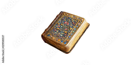 Vintage ornate book with intricate floral cover design isolated on transparent background