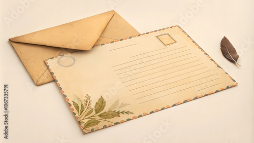 postcard, vintage, letter, botanical, design, envelope, stationery, paper, decorative, nostalgia, art, nature, correspondence, message, creativity, empty, customizable, communication, style, illustration, floral, aesthetic, writing, old-fashioned, beauty, crafted, elegant, classic, residential, warmth, warm tones, blank, inviting, heritage, postal service, greeting card