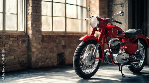 vintage, red, motorcycle, parked, upscale, studio, classic, bike, retro, vehicle, leather, seat, helmet, motorbike, garage, luxury, lifestyle, old, fashion, transportation, motorized, elegant, interior, decoration, collectable, style, sport, motor