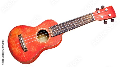 ukulele, musical, instrument, red, vintage, guitar, string, music, acoustic, hawaii, hawaiian, song, melody, rythm, chord, tune, sound, play, player, musician, concert, performance, old, worn, aged, classic, retro, antique, folk, traditional, culture, art, craft, hand-made, wooden, string, fretboard, body, neck, headstock, isolated, background