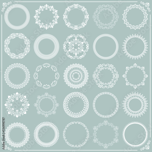 Vintage set of vector round elements. Different light blue and white elements for design frames, cards, menus, backgrounds and monograms. Classic patterns. Set of vintage patterns