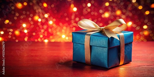 Vintage Style Blue Gift Box with Golden Ribbon on Festive Red Background for Christmas, New Year, Black Friday Sales, and Birthday Celebration Party Concept