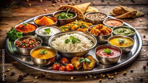 Vintage Style Photo: Colorful Indian Thali Platter with Curries & Rice