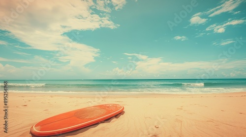 Vintage surfboard on tropical beach with calm seascape and sky summer vacation water sport concept