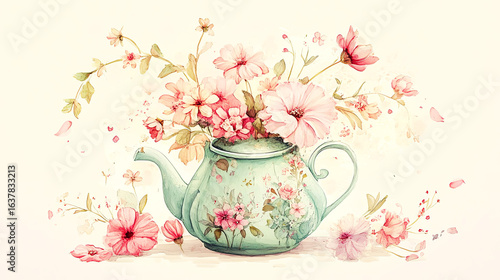 Vintage teapot adorned with delicate flowers, surrounded by blooming petals, showcasing a charming and whimsical illustration of nature's beauty and elegance