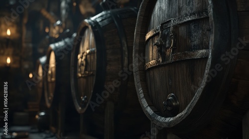 Vintage Wooden Barrels in Dimly Lit Cellar