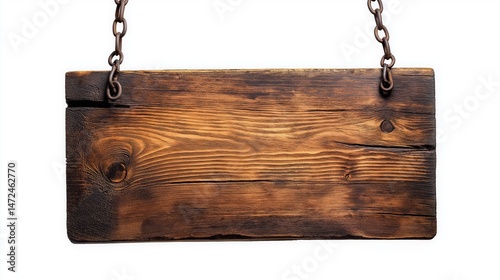 Vintage wooden hanging signboard with rustic texture and burnt finish suspended on chains, Generative AI