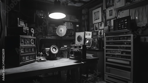 room, interior, vintage, workshop, studio, black-and-white, electronic, speaker, phonograph, photograph, frame, wooden, table, cabinet, shelf, grey, black, white, still life, retro, photo, dark, dim, soft light, shadow, ambience, hobby, design, decor, furniture, space, display, object, artistic