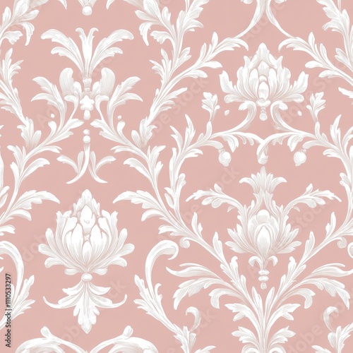 vintage-inspired floral arabesque, pale rose background, graceful white scrolling foliage, symmetrical botanical ornaments, continuous pattern design, decorative baroque style wallpaper