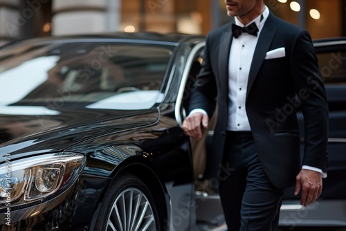 VIP Arrival - Sophisticated Man in Tuxedo Exiting Luxury Sedan with Chauffeur Assistance