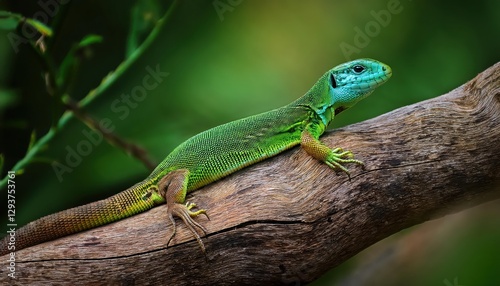 Virile Wall Lizard Lacerta agilis adorned in Regal Colors perched on Tree Trunk Majestic and Vibrant Exhibiting a Sense of Elegance and Majesty amidst Forests Serene Ambiance