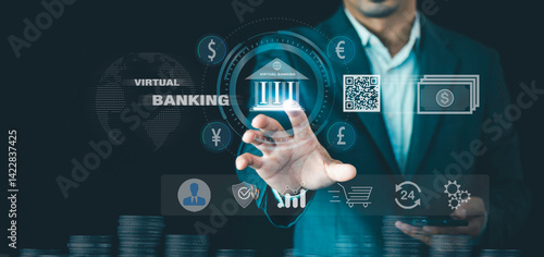 Virtual bank Concept. Central Bank Digital Currency, Financial management technology exchange, money and digital asset, transaction in different currencies, mobile banking, online payment, fintech