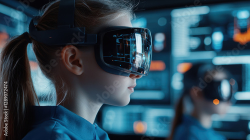 children, girl, virtual, reality, classroom, online, learning, concept, headset, technology, digital, screen, futuristic, education, innovation, gaming, interaction, youth, exploration, computer, software, development, science, life events, creativity, engagement, modern, advanced, simulation, entertainment, fun, smart, tech, earth, environment, interactive, user, interface