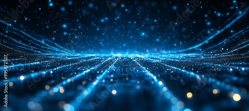 Virtual digital space technology background. Blue abstract glowing glitter. Generative AI technology.