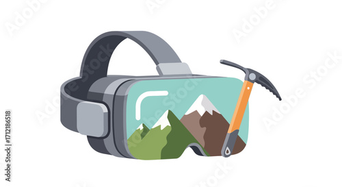 virtual, reality, headset, goggles, mountain, climbing, simulation, game, gaming, technology, digital, life events, adventure, landscape, peak, snow, ice, axe, equipment, gear, sport, recreation, entertainment, future, futuristic, innovation, device, contraption, screen, display, vector, illustration, isolated, white, concept, hobby, leisure, travel, tour tourism, exploration, nature, alpine, mountaineering, hiking, extreme, training