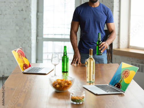 Virtual talking with friends, celebrating and drinking alcohol. All the meetings coming to remote way during coronavirus quarantine. Man having fun during online party, videocall. Prevention of covid