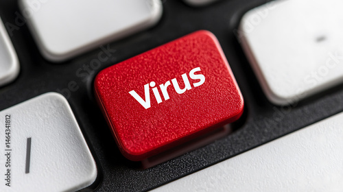 Virus Alert: Close-up of a red computer keyboard key with the word "Virus" in white letters, suggesting a warning about cybersecurity and computer safety.