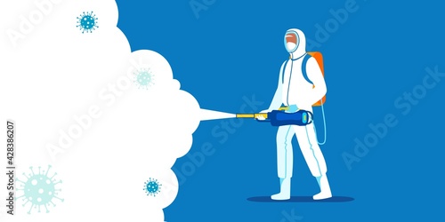 Virus disinfection concept. A man in a protective suit and mask spraying disinfectant to disinfect viruses. Vector İllustration