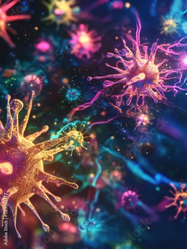 Viruses interacting with human cells showcasing vibrant colors and intricate structures under microscopic view. Generative AI