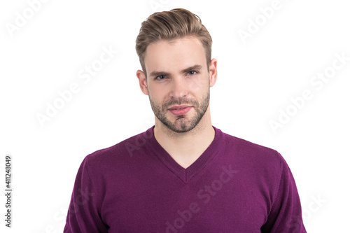 Visit your barber regularly. Unshaven man with stylish hair isolated on white. Hair salon