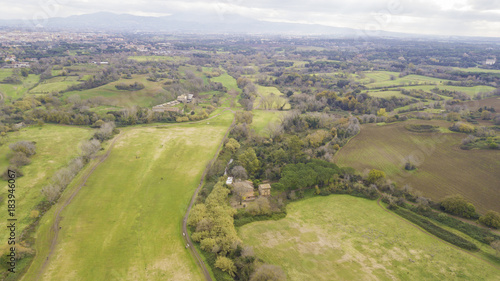 Vista aerea di un tratto di campagna italiana ai lati della città di Roma, capitale d' Italia. Sullo sfondo si intravede una montagna.