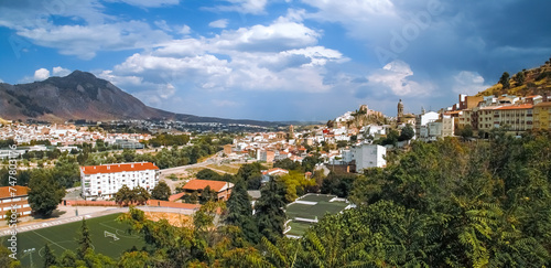 Vista panorámica de Loja desde el oeste, mirador de Sylvania. Vista de las casas y sus iglesias encajadas en el valle del río Genil. Pueblo rodeado de campos de cultivos y montañas. Loja, España.