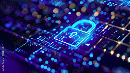 Visual depiction of a lock symbol appearing on a laptop screen representing computer protection and cyber safety concept emphasizing the significance of securing private data from hacker