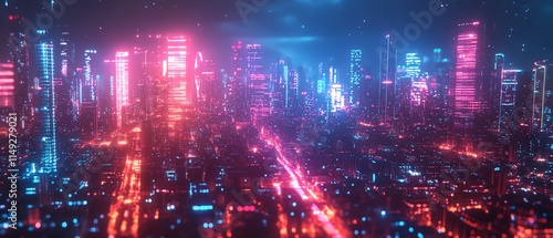 Visual representation of bright data streams flowing through a futuristic digital terrain at night, neon colors illuminating the landscape, showcasing technology and innovation