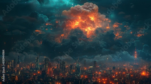 Visualization of secure cloud technology, a fortress of digital data protected by advanced cybersecurity, night time, dramatic lighting