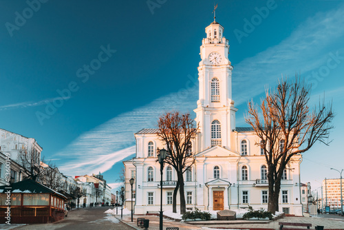 Vitebsk, Belarus. View Of Old Town Hall In Winter Sunny Day. Famous Landmark.