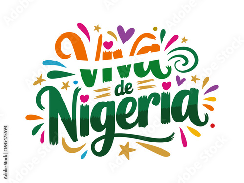 Viva de Nigeria lettering, bold script with hearts and stars, national pride design, celebratory hand lettered vector